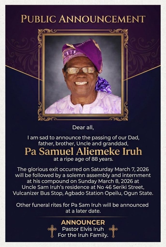 A patriarch has fallen, but his legacy stands tall like a cedar of Lebanon. We celebrate the transition of Pa Samuel Aliemeka Iruh, who began his earthly journey on January 2, 1938, and peacefully returned to his Maker on March 7, 2026. Having completed his earthly race, he passed away peacefully at his residence at No. 46 Seriki Street, Agbado Station Opeilu, Ogun State—the very home that served as a sanctuary of love and wisdom for all who knew him.