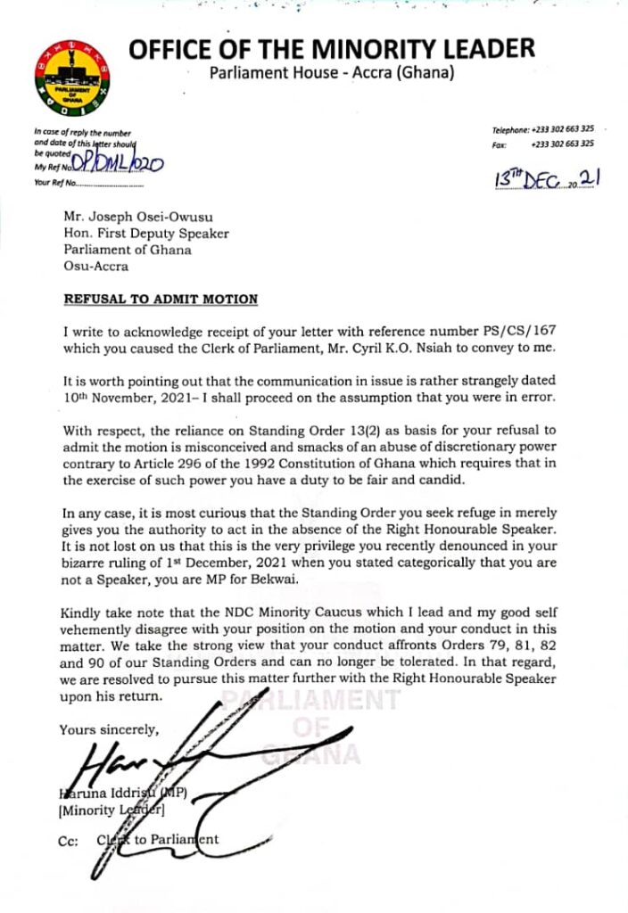 In a letter dated December 13 and addressed to the First Deputy Speaker, Haruna Iddrisu said the Bekwai MP’s reliance on Standing Order 13(2) to quash the motion by the Minority is ‘misconceived and smacks of an abuse of discretionary power’.