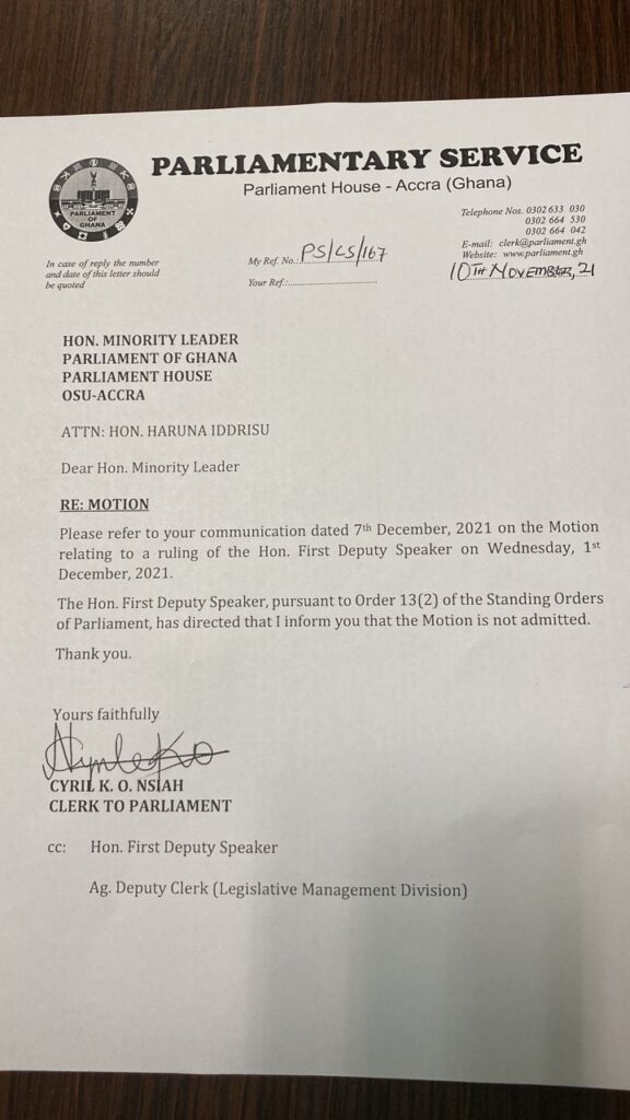 “The Hon. First Deputy Speaker, pursuant to Order 13(2) of the Standing Orders of Parliament, has directed that I inform you that your motion is not admitted,” a letter signed by Cyril K.O. Nsiah, Clerk to Parliament, said.
